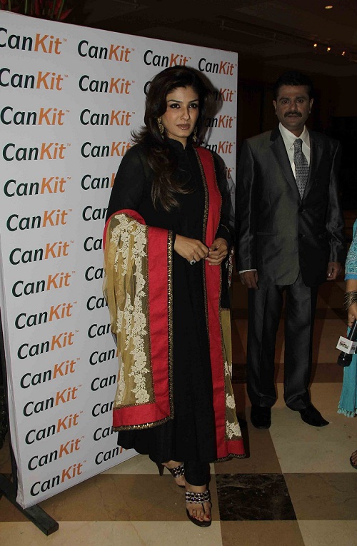 Neha Sharma in designer long kameez with full sleeves and open neck pattern.Embellished with printed work and dual color border.Paired with churidaar salwar and polka dots net dupatta.
