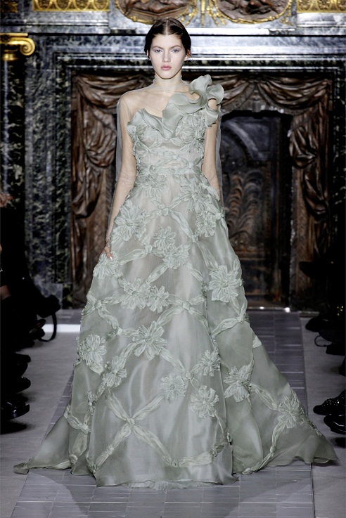 Dresses in the Valentino Haute Couture show were covered in layers of crepe and tulle, ever so slightly voluminous and ethereal. In particular, the sheer gown above features a sensual mix of almost nude organza with an overlay of intricate red piping. According to style.com, “it took 500 hours of hand-rolling to produce the piping. And that was just one of the outfits that featured the effect. One roller apparently developed carpal tunnel syndrome during the production of the collection.” Old school classic pieces still walked the runway in the form of cape dresses and garden party dresses.