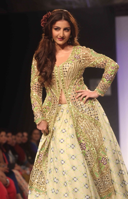 Arpita’s collection had mirror work on the blouses while prints were used for the sarees & lehengas. The colours were beige, pista green, lavender & powder blue. Soha Ali Khan took the ramp for Arpita at LFW.Soha Ali Khan Walks for Arpita Mehta.