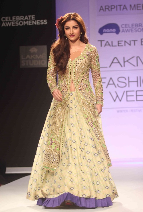 Soha Ali Khan in beautiful cream designer printed lehenga. Designed by Arpita Mehta at Day 2 LFW Winter/Festive 2013. Blue printed designs all over lehenga and double borders. Paired with designer saree blouse.