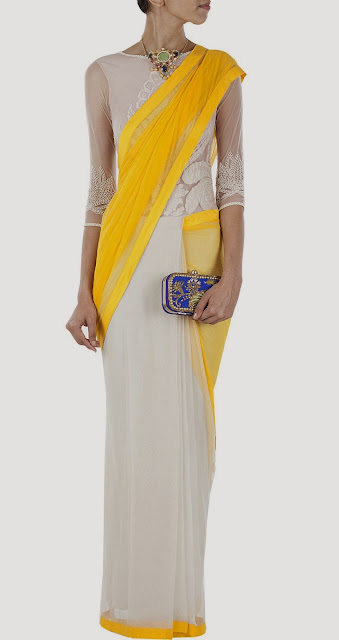 Featuring a yellow sari gown with chantilly lace pallu.